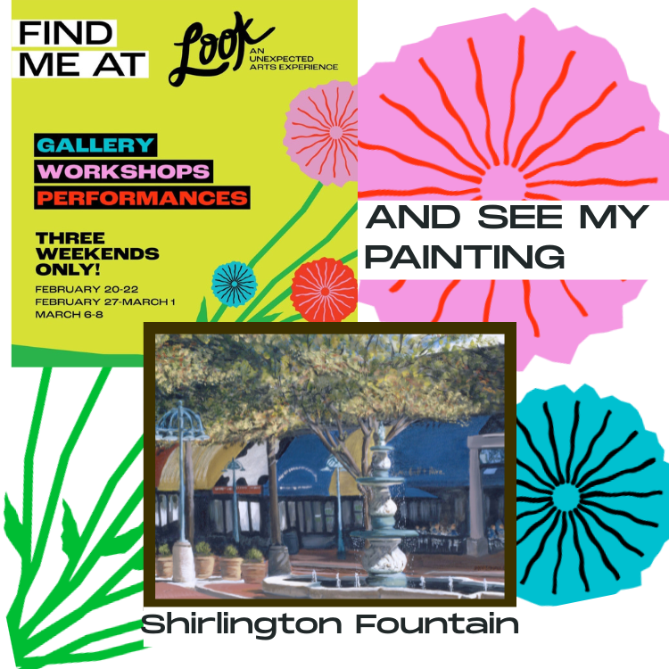 For three weekends in February and March, come and see my painting "Shirlington Fountain" along with paintings from other members of the Arlington Artists Alliance. For more information, visit https://www.lookarlington.com/